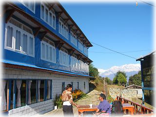 地獄のように続く階段を登りきり、ヘロヘロになりながらようやくたどり着いたロッジ。見晴らしのいいテラスでは、トレッカー同士くつろぎながらお茶を飲んでいた。屋上からはアンナプルナがそびえたち、はるか下にはいままで通ってきた村々が見渡せる。部屋はシンプルな山小屋だが、ただのほったて小屋のため、隣室の音は丸聞こえ。ホットシャワーは残念ながら出ず。ダルバートは実においしかった 滞在;2002年10月30日 |