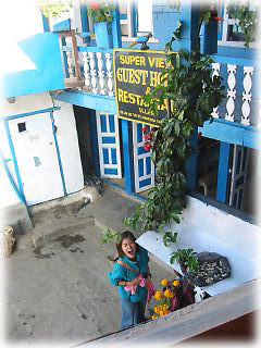 広いベットがふたつ入ってもまだ広々とした美室、3面の窓から差し込む光、そして部屋にいながらアンナプルナ山群がばっちり見えるロケーション。おまけにテラスで朝食も食べられるし、洗濯物を干す台もあるし、ホットシャワーはジャブジャブ出るし、宿のオーナーはいい人だし……と極楽づくしだった。これでこの値段だから、笑いが止まらない。ポカラは宿の供給過多で探せばここより安い部屋はいくらでもあるだろうが、この場所で「1Nルピーでも安い宿!」と考えるよりも、こういった場所だからこそちょっと多めに出しても宿のグレードを上げるほうが得策では? と思った。その極楽さにつられ、予想外に長居をしてしまった 滞在;2002年10月16〜29日 / 11月3〜6日 |