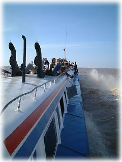 先の過酷な移動ですっかりしょげてしまった私たちが選んだのはボートでの移動。しかし宿が1泊4ドルというということを考えるとかなりの高額だろう。朝5時半にトラックでピックアップしてもらい、船着場まで行く。この道では素朴なカンボジアの田舎の風景が見られた。そこからボートに乗り換え、5時間ほどでプノンペンに到着する。このボートも、川べりで船で暮らす人々の暮らしが見れ、子供たちは船に向かって手をふってくれた。バスでの移動はは7ドル程度のため、3倍以上の値段を払うことになったが、私たちはボートを選んでよかったねーと満足している。楽だったし(笑)。ただし、船の屋根部分に乗っていたらかなり日差しが強烈だった。 |