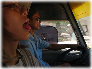 キャピトル・ホテルで申し込み。プノンペンからカンボジア国境のバベットまでは25人乗りのミニ・バス。カンボジア国境まではほとんど未舗装路か、舗装されていても穴ぼこだらけという状況。ただしタイからカンボジアに入国したときのシソポン〜シュムリアップ間よりはまし。私たちは運良く運転席の隣に乗れたため、揺れはさして気にならなったが、うしろに乗っていた人たちは座っていながらもポンポン飛び跳ねていたという。ベトナム側の国境モクバイにてシン・カフェの45人乗りエアコン・バスに乗り換え。ここからは道もバスも格段によくなり、天国。国境を越えるだけでこんなにも道路状況や風景が違うものなのね、とふたりで感心することしきり。 |