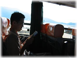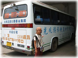 12時半に河口を出て、夜10時半に昆明に到着。トイレ休憩のみで食事休憩はなかった。食いしん坊の中国人がこれで大丈夫なのかと心配したが、窓からカップラーメンを捨てているおじさんを見て(詳しくは「旅の日記」)、そんな心配は無用だったことに気づく。道のコンディションはいたって上々で走りは快適だった。 |