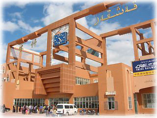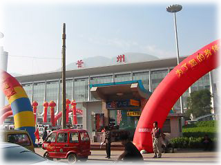 午後9時に出発し、翌朝9時に敦煌に到着した。この頃になると味をしめて硬臥にしか乗る気がしない(笑)。ウルムチ〜敦煌が始発、終点という列車だった。敦煌は観光地としては有名だけど、街としての規模は小さいからか、終点まで乗る人はそんなに多くなかった。駅は敦煌市街から130キロも離れた寂しいところ。市街までは15元のミニバスを利用したが、駅からちょっと走るとすぐに砂地になった。駅から市街まで2時間の距離はちょっとおっくうだけど、敦煌が確かに砂漠のオアシスなのね、と実感するにはもってこいの道かも。 |