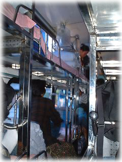 夜行寝台バス。夜9時半に出て朝6時に麗江に着いた。古いタイプの寝台バスはふたりでひとつのベットらしいが、わたしたちが乗った新しいタイプのバスにはひとりひとつのベットがあった。身長180センチの夫には若干狭いようだったが、妻は快適に寝ることができたようだ。高速道路をガンガンに飛ばしながら走るが、夜だったため恐怖感はなし。 |