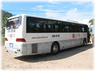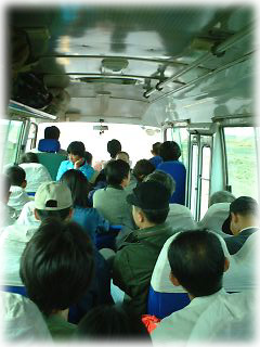 朝6時半に出発し、バス、バス、トラックと乗り継いで夜の10時半に到着するという地獄の移動。詳細は「旅の日記」にあるとおり、悪路の中をひたすら揺られるという、一番最初の移動にして、たぶん一番過酷と思われる経験をしてしまった。カオサン通りの旅行代理店にて申し込む。代理店によって150〜220バーツまでのバラつきがあるが、内容はどれも同じようだ。ただしこれは運の悪かったケースで、運がよければずっとエアコン・バスということもあるらしい。ちなみに、私たちの3日後に到着した旅行者はエアコンなしのバスで到着していた。 |