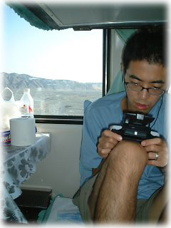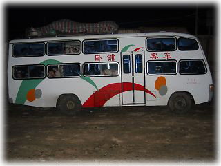 久々のバスでの移動。寝台バスだが、ベッドは雲南省のバスと比べてかなり狭かった。夜出発のくせに、途中で運転手&車掌が食事休憩をとり、乗客はブーブー文句を言っていた。その代わり、トイレ休憩が多かったのはありがたかった。午後7時30分に出発し、翌朝ゴルムドに到着。なお終始真っ暗だったため、景色などはまったく楽しめなかった。 |