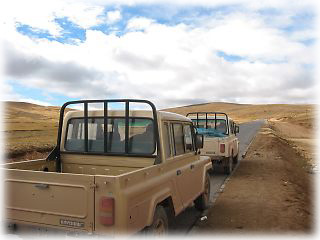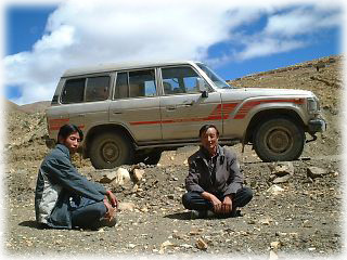 移動日:2002年9月24〜27日 手段:ランドクルーザー 料金:5人で5500元 ジョカンのそば、SNOW LAND HOTELの2階にある旅行代理店「FTI」にて申し込み。ボーダーまで3泊4日、ガイド+ドライバー込み(宿泊費、食費は別)で5名のメンバーでこの値段。そのルートを通るのに必要なパーミッション代も込みだが、ベースキャンプへの入域料(ひとり146元)は自分たちで払う。日数を少なくしたりすればもっと安くなる。4年前、同じルートを通ったときよりは若干値上がりしているような気もするが、何よりそのときはガイドとドライバーとウマが合わず苦労したのを覚えている。 今回はギャンツェ、ラツェ、エベレストBCで一泊ずつするルートだったが、実際は最終日がタシゾムに変更になった。ガイドとドライバーいわく「エベレストB.C.に泊まると国境到着が明日の夜かなり遅くになる」らしく、確かにいままでのペースを考えると厳しいと私たちは判断したため、変更したのだ。実際、彼らの言葉は本当だったのだが、「なら先に言え!」とそのルートでOKを出した旅行代理店に立腹するもなすすべはナシ。ガイドに関しては宿も飯もオススメはあるものの、断っても問題なかったし、お金の問題もなく、ちょっと気がきかないところを除いては、まあまあイイ人(つうより「悪い人じゃないんだけどね〜」という感じ)だったので、今回はアタリだったようだ。 車はTOYOTAのランドクルーザー。さすがランクル! と思うのはその乗り心地。ほとんど未舗装道路を通っていたのだが、バスや北京ジープと呼ばれる中国製のジープに比べたらサスの効きがまったく違って揺れもなめらかなのだ。後ろの荷物置き場は特設お昼寝ベットとして、乗った人は次々と寝こけていた。 道は国境そばのダム手前が土砂崩れでかなりの悪路。道のまんなかに川が流れていたりするし、道が崩れていたりするし、道は深い谷沿いに作られているからもし落ちたらまっさかさまにサヨナラ〜って状況に加え、モウモウと霧まで出てきたからかなりスリリングだった。ただしチベット人のドライバーは珍しく超安全運転だったので結果的にはなんの問題もなかった。それ以外の道は思ったよりも整備されていて、ドライバーもラクチンに走っていた。ただこのルートだと標高4000〜5000メートル付近を走るため、ところどころ雪が降っていたりして、寒かった。高山病はラサで高地順応したあとなので、まったく問題はなかった。