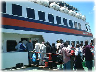 帰りはどうしても日中に帰りたかったので、料金的にはかなり高いが、スピードボートを選んだ。ちなみに日中にザンジバルから帰るには午後1時と4時のスピードボートのみ。安い便は夜に出て船上で一泊して朝到着する便のみ。夜の船旅はあまりおもしろくないし、揺れる船で一泊するのはキツイかなと思ったので、まあ仕方ない選択だろう。ちなみに高いだけあって、午後1時に出て3時には到着とアっという間だった。エアコンは一応効いていたが、かなり暑く、汗びっしょりに。