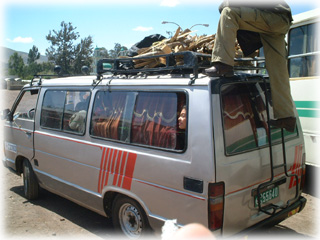 アジスアベバのマルカート市場近くの長距離バス・ターミナルから毎日バスが出ている。本数も結構あるらしく、私たちは朝8時ごろ出発のバスに乗った。前売り券のようなものは必要なさそう。旅行人などには所要6〜7時間と書いてあるが、5時間くらいで到着した。途中20分程度の休憩あり。帰りは乗り合いのミニバン(いわゆるマタトゥ)に乗った。満員にならないと発車しないので出発まで待たされたが、出発したあとはバスよりも速かった。