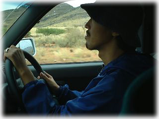 初のレンタカーで、砂漠に行くという大冒険?な行程。といっても所詮はレンタカーなんだけど、それでもラリーをしているような高揚感のあるドライブだった。ラッキーなことに、普通車を予約していたら、レンタカー会社の都合で四駆を貸してもらえることになり、出だしから好調だった。朝9時に出発して、宿に寄ったり昼食を食べたりして、午後3時過ぎにソススフレイに到着。道は首都ウィントフックから出てすぐにダートっぽい未舗装路になるが、穴ぼこなどはあまりなく、平均時速90キロぐらいのペースで進めた。都会からアップダウンのある岩山道を通り、そして砂漠に突入していく……まるでアドベンチャー映画のような風景に、子供のように車の窓にへばりついてしまう妻(笑)。本格的な砂地を走るのは最後の5キロぐらいだが、それでもへっぽこな私たちはやっぱりスタックした。まあそれも砂漠の思い出だろう。だいたい、砂漠で運転できることなんて、一生にそうあることじゃない気もするし。「あ、ここ!」と思ったところで止まれるのも車のよいところ。延々と続く一本道を見ながらのんびりとたばこをふかしたのもまたご一興。レンタカーの手配はウィントフックにある旅行代理店「Tourist