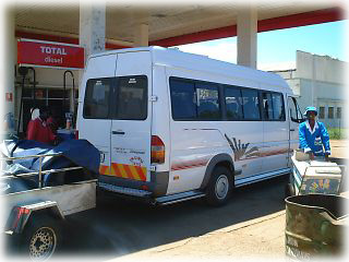 INTERCAPEという南アフリカの会社が運行する国際バス。なんと70ドルもする!ってことにマジでビビッた。しかも70ドルのくせに……と思う出来事もモロモロあり。週2便、毎週水・日曜日運行。チケットはUSドルもしくは南アランド払いで、前日までに指定の旅行代理店「Backpackers