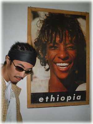 エチオピアに着いて早々、宿の部屋でにっこり迎えてくれたエチオピア人青年のポスターと一緒に。「やっぱアフリカではコワモテでいかないと」なダンナ。髪型もブレイドにして意味もなくサングラスもかけて(笑) |
