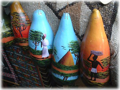 いかにもアフリカっぽいペイントがされた飾り物。こんな大きいものは買えないので、写真でガマンの子 |