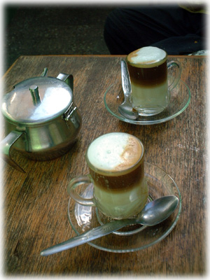 コーヒーを入れるやっぱり美人なお姉さん。エチオピアのコーヒーは、期待どおり実においしい! アジスアベバではちょっとしたカフェにはちゃんとエスプレッソ・マシーンが置いてある。かつてイタリア領だった時期の名残 |