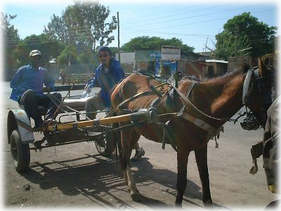 ![]() アジスアベバからバスで6時間ほど行ったシャシャマネ村ではいまも馬車が活躍中。乗っているとなんだか優雅な気分になる。ただ、お年寄りの馬にあたると、走りながら馬がハアハアいっていたりして、ちょっと申し訳ない |