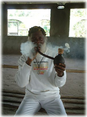ラスタ・パパ、ただいまハーブ中。ナイヤビンギ(礼拝)のあるこの日は全身白づくめのスタイル。ナイヤビンギを取り仕切る、ラスタの布教家でもある |
