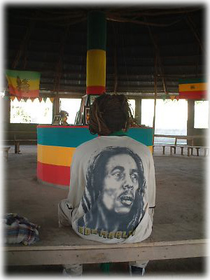 ナイヤビンギの礼拝堂の中では、ドレッド頭の若い青年がじっと座っていた。ボブのTシャツもこういうところで見ると説得力が違う |