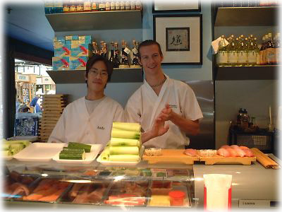 ![]() ケープタウンは港でシーフードが豊富なせいか、SUSHIバーが大人気。街のいたるところにあって、こんなお兄ちゃんたちが握ってくれます。このスナップの直後、「私たち、日本人なんだからね!」とデンとカウンターに腰をおろして臨戦体勢に入りました(笑) |