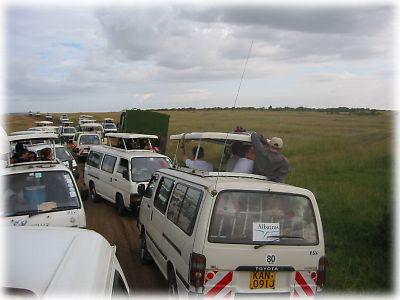 ![]() アフリカの大地! といえども、やっぱりここは観光地なのです。人気動物がいるとご覧のとおり、どこからともなくサファリ・カーがうじゃうじゃ。もちろん客はほとんどが外国人 |