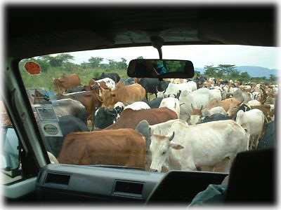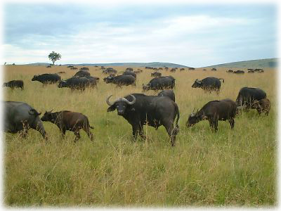 ![]() サファリ・カーに乗っていると、突然目の前を牛の大群が川の流れのように押し寄せてきた。こちらは保護区内のマサイ族が飼っている、れっきとした家畜です |