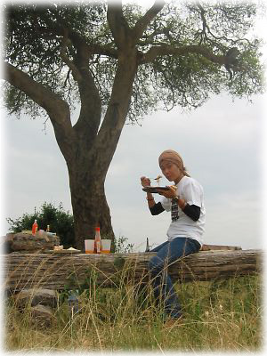 サファリ中に保護区内の木の下でランチ。ちなみにガイド氏いわく、「前にこの木にヒョウが登っててランチできなかったんだよ、ははは」とのこと。うーん、オチオチ飯など食べてていいのかしらん? |