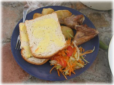 ![]() こちらが本日のランチ。パンにチキンにポテトにサラダ。最安値に近いツアーなのに、お味も量もケッコウなものでした |