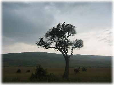 ![]() ぼんやりと夕暮れを眺めていると、木の上になんだか物体が。ガイドさんに説明されたのだけど、名前を忘れてしまった(笑)。これだけ巨大な鳥が止まっているにしては、木が小さいような気がしたのだが、本人達はせっせと卵を温めている模様 |