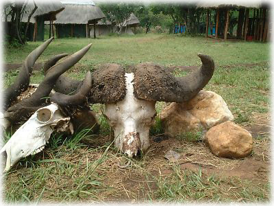 ![]() 私たちが宿泊したキャンプ・サイトの前にデデーンとバッファローの頭蓋骨&角が置かれていました。ちなみにバッファローの肉は硬くてあまり美味しくないらしい |