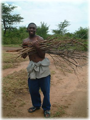 つうわけで、ただいま薪を拾い中。今晩の夕飯用にこんだけ集めたよう!とニコニコ顔のお兄ちゃんをパチリ。でもここももちろん保護区内。こんなノンキなことしてて、動物に襲われないのかしら……とちょっと不安になる |