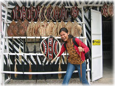 ![]() サファリの途中では、もちろんお土産屋さんに寄ったりもします。マサイの盾と槍でちょっとその気になっている恥ずかしい写真(笑)。しかもちょっと欲しい…… |