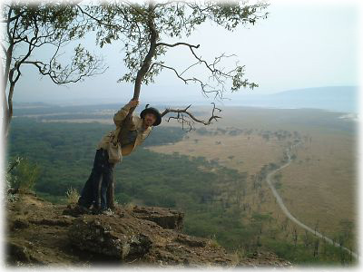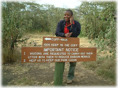 ![]() ガイド兼ドライバー氏、山頂で携帯電話中。アフリカのサファリ中だって、携帯電話でお話しちゃう時代なのです。仕事の電話? それともギャル? |