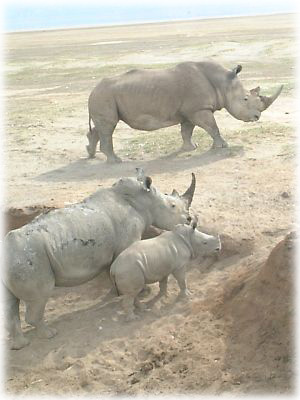そう! ナクル湖ではぜひ見たかった動物、サイ。親子でのっしのっしと歩いている姿はまんま恐竜のような気がする。想像上の動物、ユニコーン(一角獣)にいちばん近い動物なのでは? |
