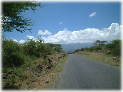 ![]() サバンナの中に一本道が続く。国道といえども、対向車もあまり多くない。意外なことに東アフリカはアジアに比べて道の質が断然いい。バスもすいすい飛ばしていく |