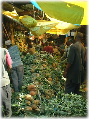 国境近くの町アルーシャのセントラル・マーケット内部にて。「おりゃあ」とばかり積み上げられたパイナップルの山。次々と売れていってました |