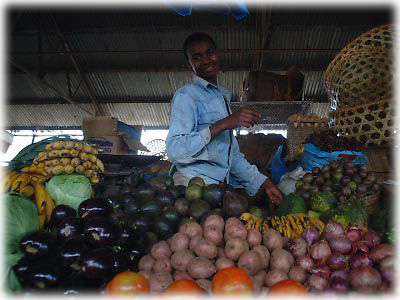 ![]() 野菜を売るお兄さんのはにかんだ顔がカワイイ。アフリカ=食べ物がないというイメージがあるけれど、市場に売っているものは多種多様。なのにそれを食べさせてくれるレストランが少ないところが旅行者にとってツライ |