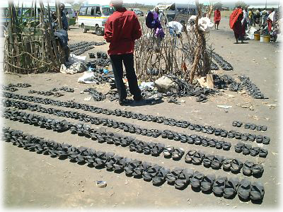 ![]() マサイ族の愛用サンダルは廃タイヤから作ったもの。履き心地は悪そうだけど、マサイ族によく似合う。意外といろんなサイズが揃っていた(当たり前か) |