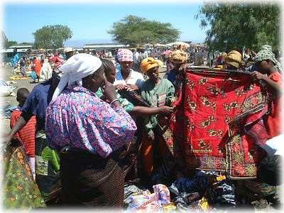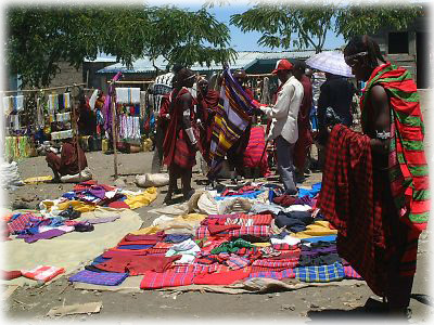 ![]() マサイ族のトレードマークである赤い布を売る店。マサイ族の男性グループがかなり時間をかけて値切っていた模様。マサイ族は男性もオシャレ心が強いのだ |