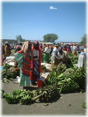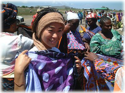 ![]() 「バーゲンだわ、バーゲンだわ」とばかりにオバサンが群がる。世界各国共通の図? ちなみにカンガという布の大安売りで、このあたりのオバちゃんはみんなこの布を腰に巻いている |