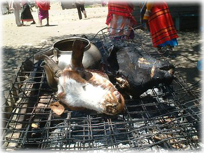 ![]() マーケットの隅では山羊さんの頭がチョンと切られて、ヤカンと一緒に炭火焼にされてました。ちょっとグロテスクだけど、オイシイのかしらん? |
