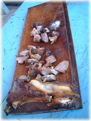 こちらがアフリカ式焼肉、ニュマチョマ。炭火焼きにした肉をひと口ずつ切り分けて塩でいただく。味は美味いんだけど、とにかく硬かった |