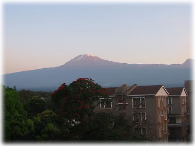 ![]() キリマンジャロに向かって昇る朝日。ちなみに山の頂上から見る朝日は思わず敬虔な気持ちになってしまうぐらいスバラシイらしい。下からでも十分感動的(負け惜しみ?) |