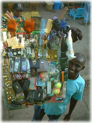 「あーい、どれでも好きなの買ってください」と愛想をふりまく物売りお兄ちゃん。タンザニアではこうやってボードに貼り付けて売る人が多い。よく見ると「一体誰が買うの?」っていう品物もあったりして(笑) |