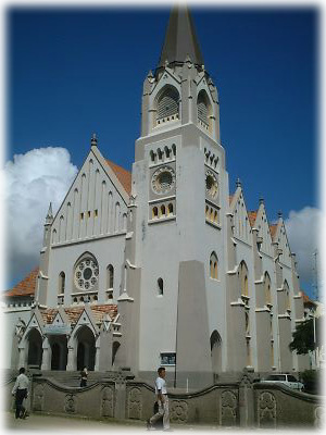 もちろん、立派な教会もあります。青い亜熱帯の空に、白っぽい教会が映える。こういう暑いところの教会もなかなかいい。昔住んだことのあるフィリピンのマニラの教会を思い出してしまった |