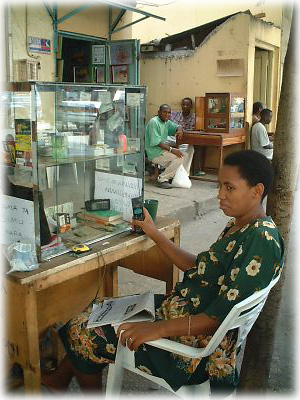 街にはカード式の公衆電話もありますが、「携帯公衆電話屋」もポピュラー。おばさんがブスっと座って店番しています。ちなみにかけたい番号をつたえると、おばちゃんが携帯でかけてつながると「ホラ」って渡してくれる |
