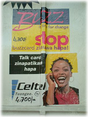 来る前には「アフリカには携帯なんてないんじゃないの〜」なんて思っていましたが、それは偏見でした。都市部では結構携帯を持っている人が多い。街にもこんな携帯のステッカーをよく目にする |