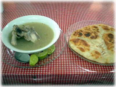 ![]() タンザニアの安食堂の朝食はこんな感じ。チキンスープとチャパティ。始めは「朝からこんなもん食えるか」と思っていたけれど、味はかなりウマイ。やみつきになってしまった |