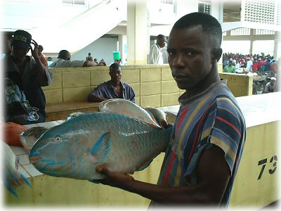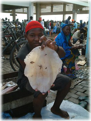 魚市場は今日も大繁盛。アフリカに来て、久々にこれだけの魚を見て、私は大興奮。買いたい……でも宿にキッチンもないし、今日は見るだけでぐっとガマン |