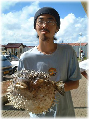 デカイふぐとふぐ顔のダンナ。こいつはバレーボールよりでかいサイズで、海の中で会ったらビビるだろうなあ。沖縄でもこのふぐのおみやげ物はよく見ますね |