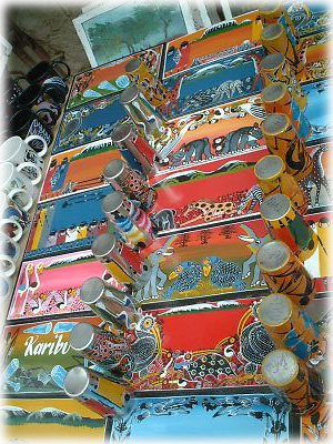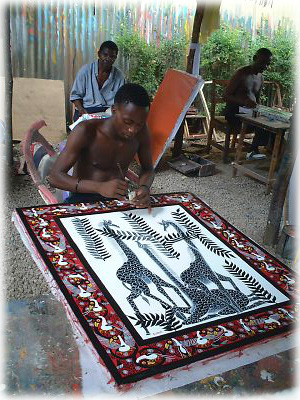 市場のあとは、タンザニアのおみやげ物として知られるティンガティンガ・アートの即売所へ。職人さんたちが裸で絵筆を振るいます(笑)。このティンガティンガという絵はペンキで書かれていて、かなりイケてます |