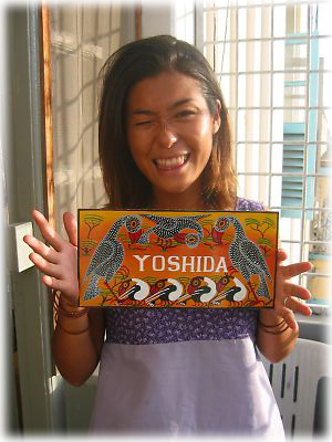 悩みに悩んだ末、一枚のボードを選んで名前を入れてもらった。が、よく見ると名前の間隔がいびつではないか?(笑)。 まあアフリカっぽいからこれもありとしよう |