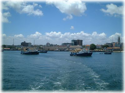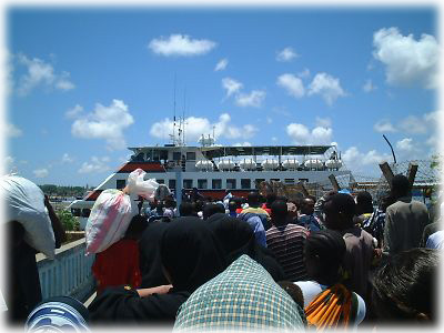 ![]() 街の真ん中には港があり、毎日何本もの船が出入りしています。こちらはザンジバル島に行くフェリー。混んでます。暑いです |